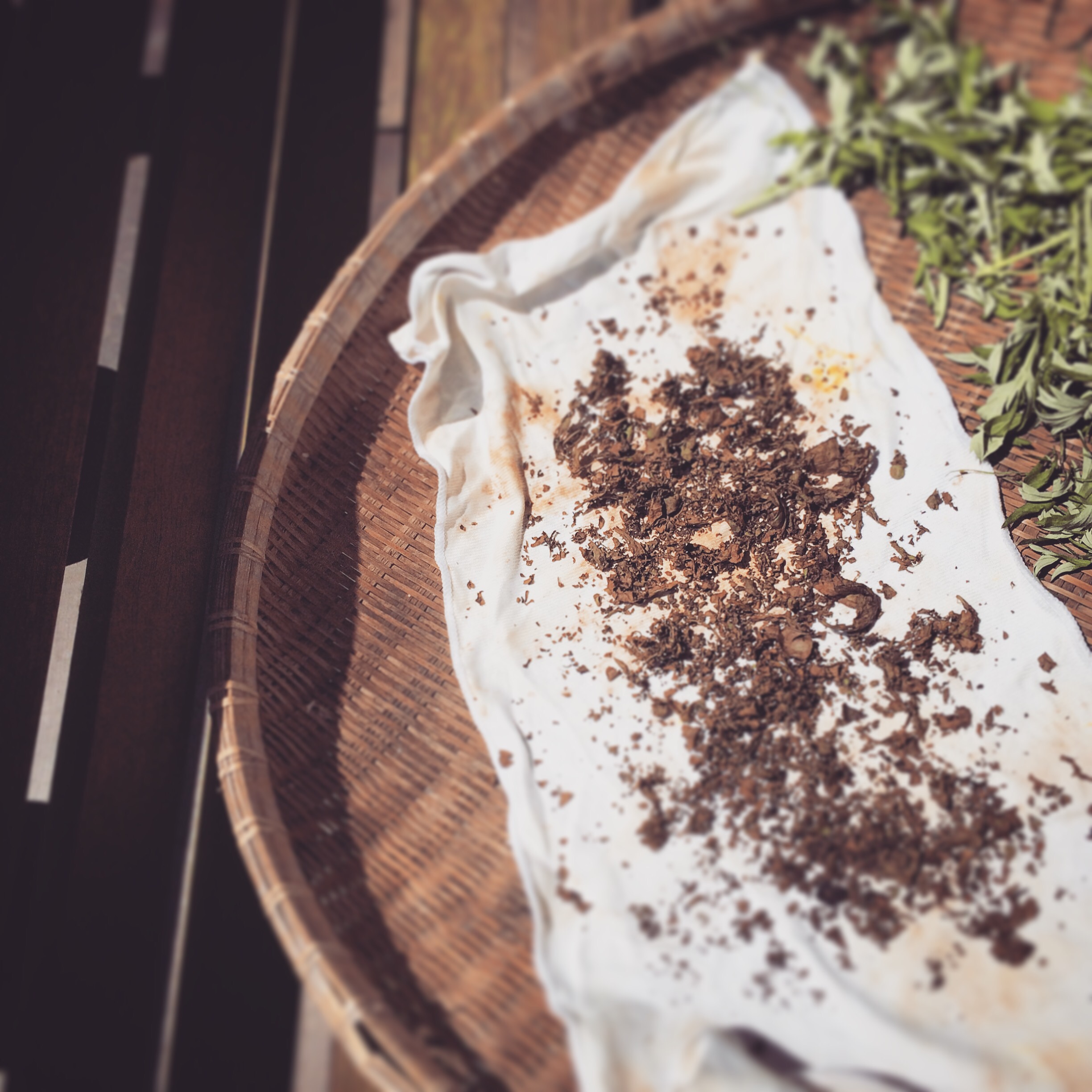翌朝、茶葉を広げて日光でよく干す。